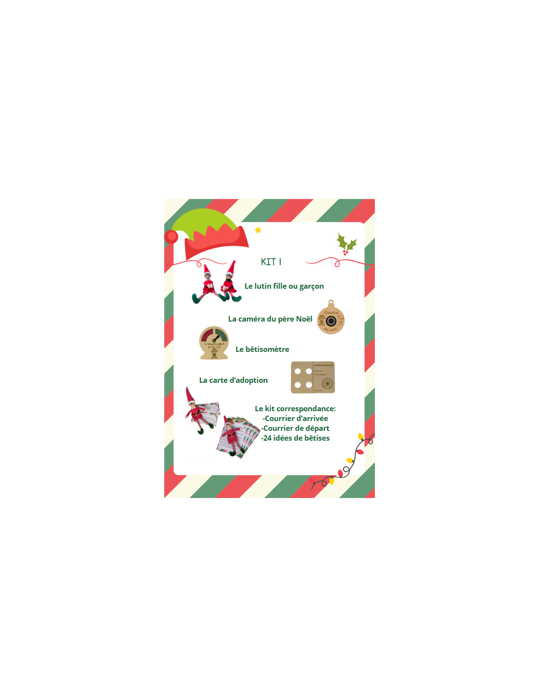 • Kit 1 (Essentiel avec Lutin) : Le lutin et son certificat d'adoption, la caméra du Père Noël, le bêtisomètre, les courriers du Père Noël.