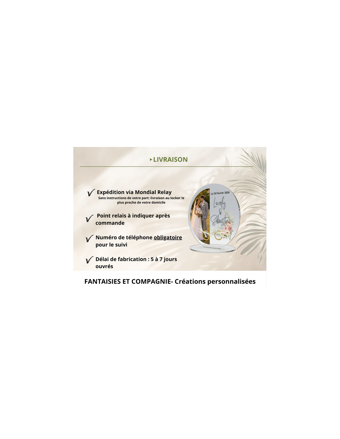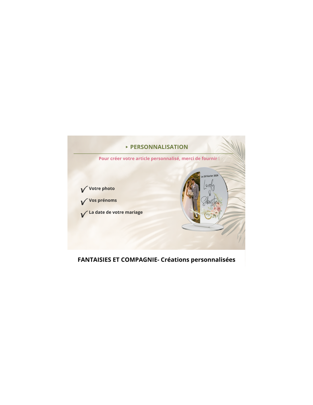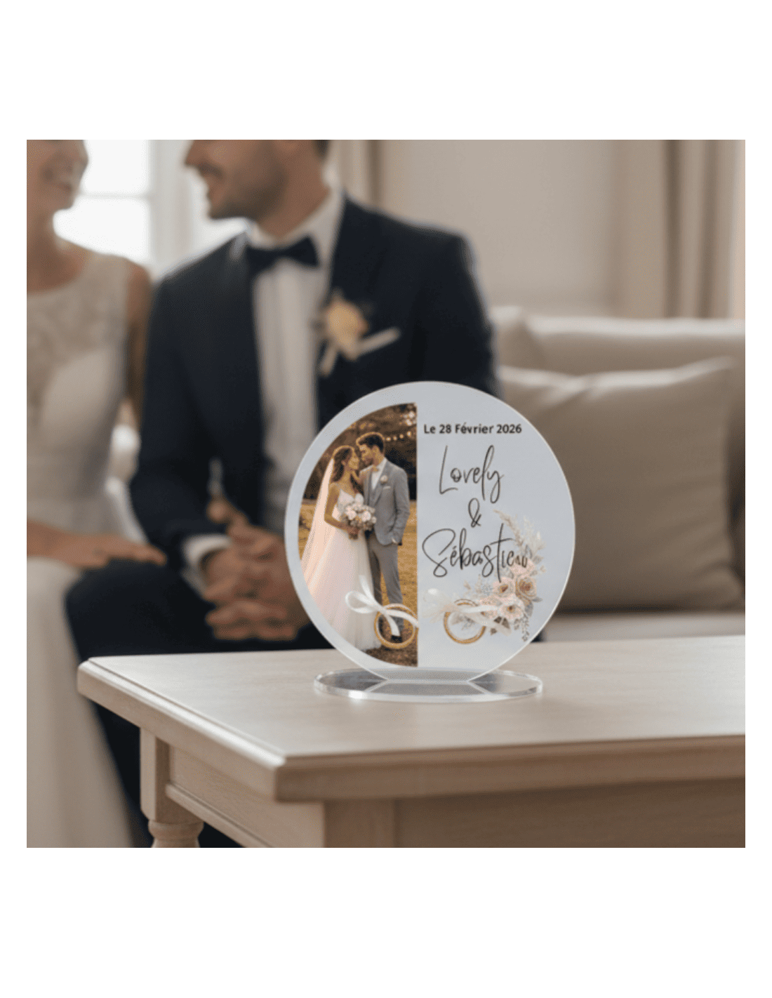 Grâce à l’impression directe sur la matière, votre photo, vos prénoms et la date de votre union sont sublimés pour créer un souvenir intemporel que vous pourrez conserver après le grand jour.