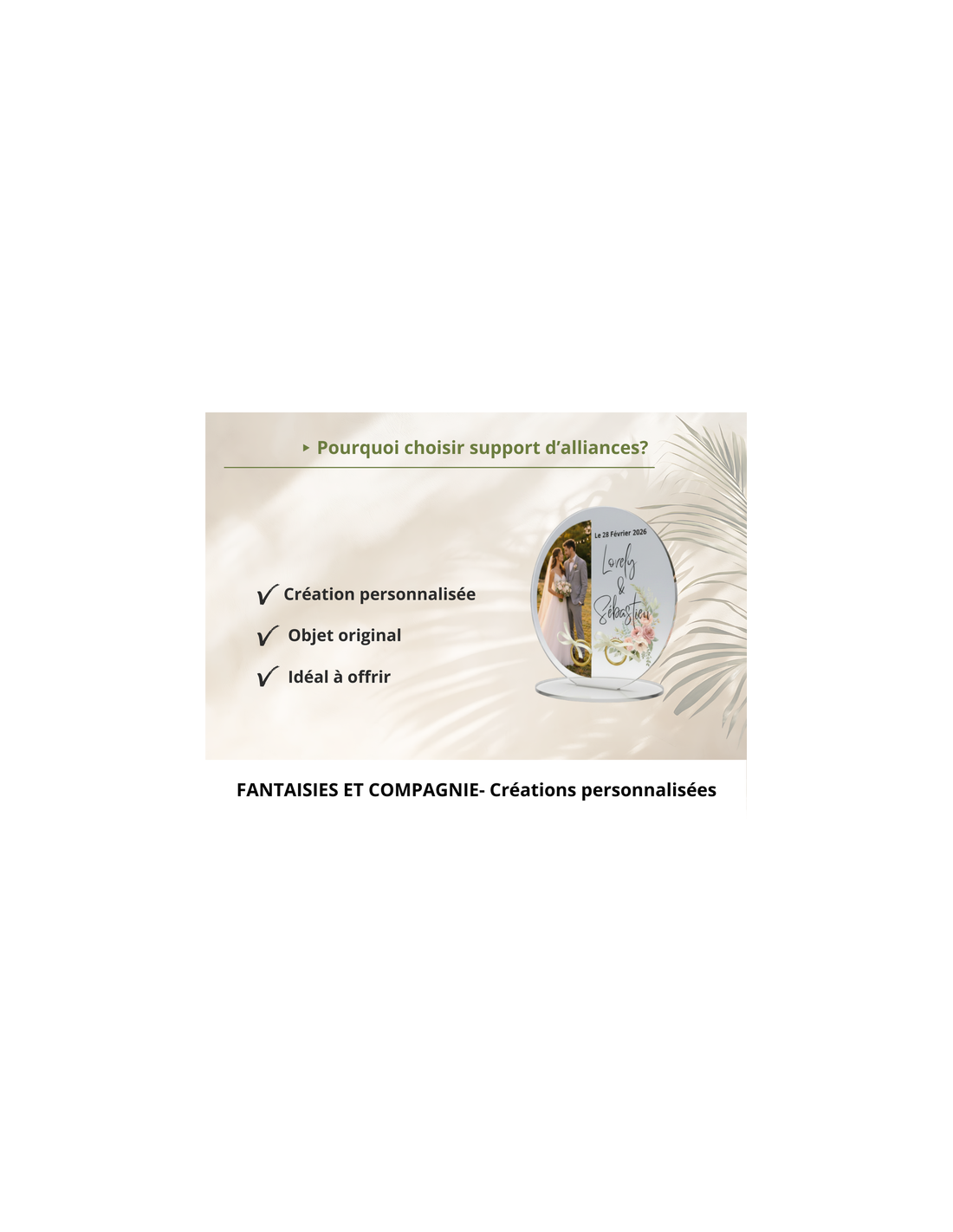 Apportez une touche unique à votre mariage avec ce support alliances en acrylique personnalisé, une création moderne et raffinée qui mettra en valeur vos alliances lors de la cérémonie.