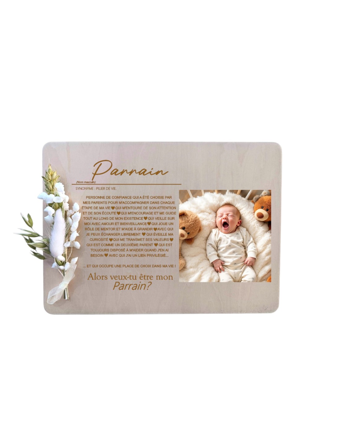 Une demande unique pour un rôle exceptionnel avec ce cadre en bois personnalisé, idéal pour annoncer une naissance et faire une demande inoubliable à un futur parrain.