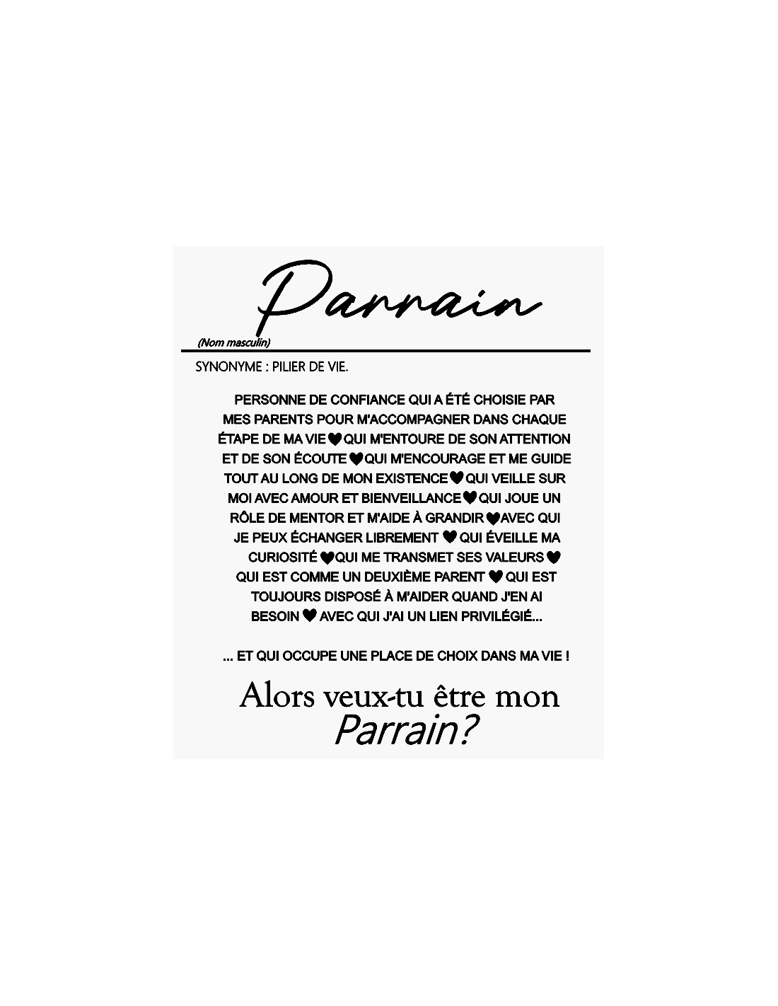 Complétez votre personnalisation ci-dessous :Ce cadre en bois personnalisé pour demande parrain est une manière originale et pleine d’émotion d’annoncer une naissance et de poser une question importante : accepteras-tu d’être le parrain ?