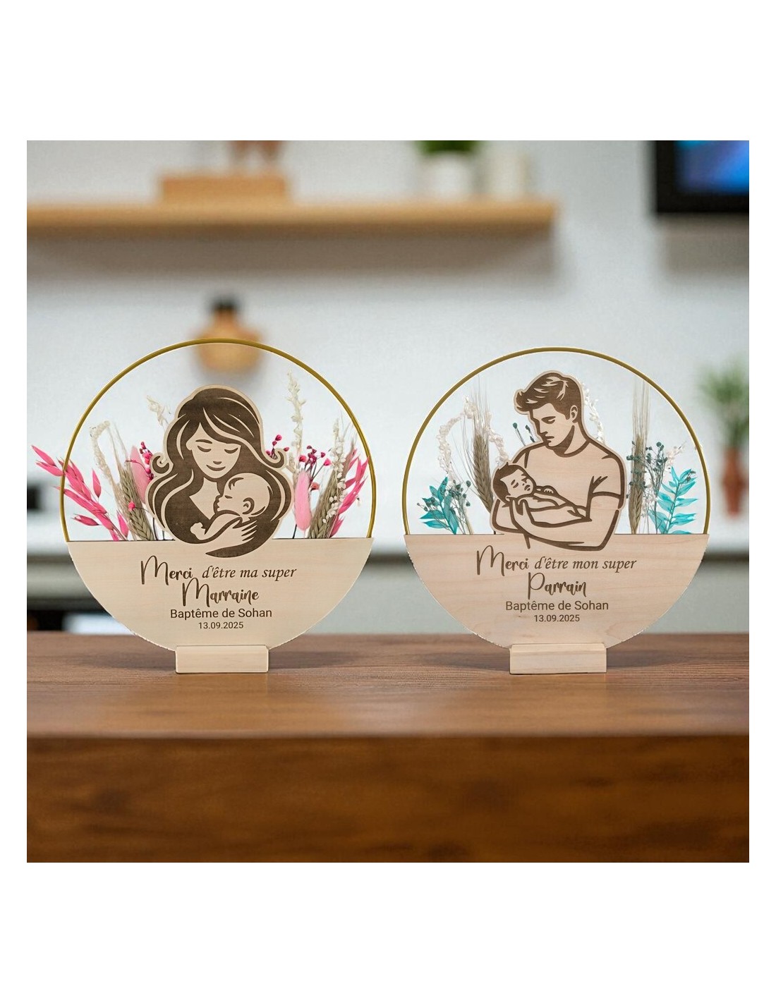 Cadre Cadeau Baptême Parrain Personnalisé - Cercle Doré en Bois Gravé