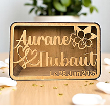 L'urne de mariage est l'un des objets les plus traditionnels de la réception. Aujourd'hui, elle se modernise et devient une pièce de décoration à part entière. L'Urne de mariage en bois personnalisée est l'exemple parfait. Conçue pour recueillir les enveloppes et les cartes, elle apporte une touche de sophistication à votre table des cadeaux.