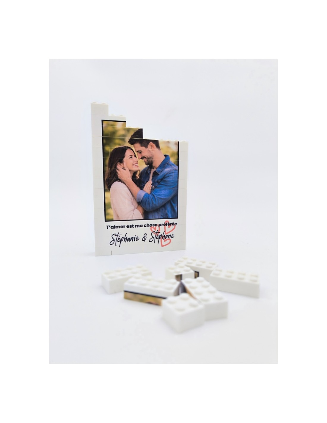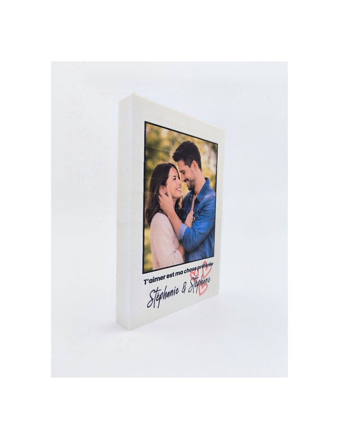 Ce cadre photo puzzle personnalisé est composé de briques de construction de type Lego®, assemblées pour former une image unique à reconstituer pièce par pièce. Il met en valeur votre photo préférée, accompagnée de prénoms et d’une phrase personnalisée.